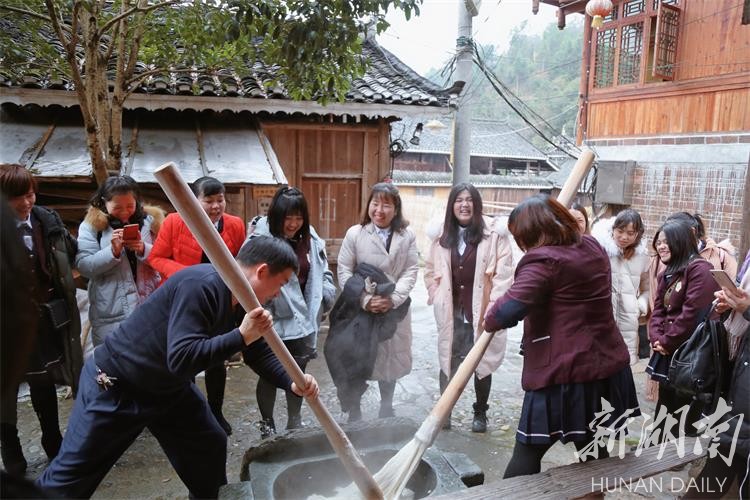 1月4日上午,通道皇都侗寨,游客们体验侗家民俗——打糍粑,感受不一样的“雪峰山的年味”,现场欢声笑语不断。近年来,该县不断挖掘丰富民俗文化资源,让游客感受侗族特色文化,体验丰富民俗活动,融入侗寨生活的氛围,推动景区从大众观光旅游向深度体验旅游发展。打糍粑是侗族几千年流传下来的习俗,具有浓厚的乡村风味。糍粑的食法多样,可以水煮、油炸等,味道各异且方便。(吴阳 赵志高 摄影报道)