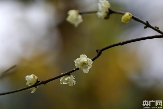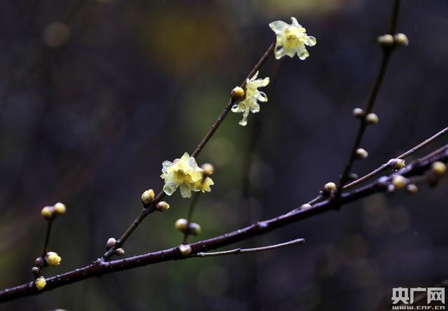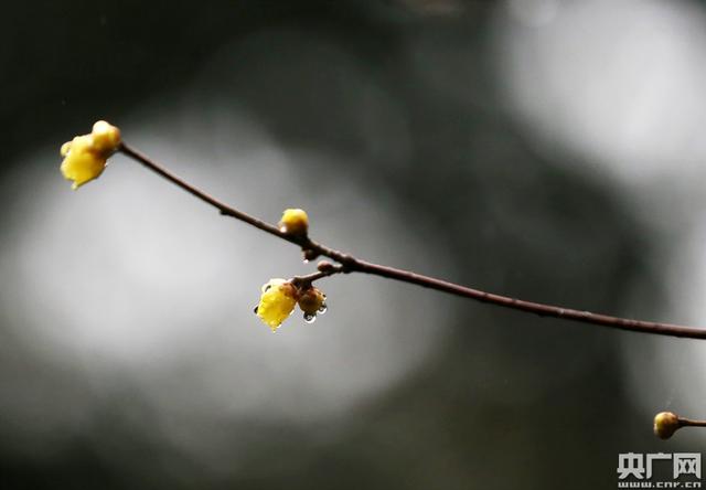 1月4日,雨滴打在杭州植物园内一支腊梅上。(央广网记者 魏炜 摄)