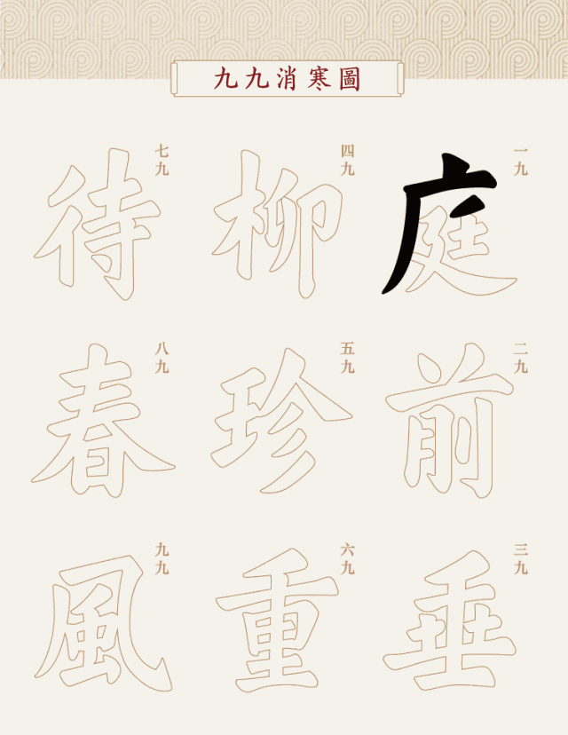 从元代开始,皇宫到民间都时行“九九消寒图”,但每个字(繁体字)都是九笔。每年冬至节前挂在室内,从头九第一天开始填起,逐日填廓,每天一笔。每填完一字,便过一九,句成而九九八十一天尽。