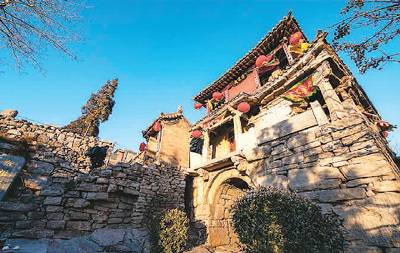 其实,这种雅致或者说文化气息在石头村满目皆是。村子不大,竟然有三处戏台,戏台前方都有一口石井,是天然的“扩音器”。还有真武庙、全神庙、观音阁等建筑,都是明清时期的。我还注意到,每家门口都挂着木制的楹联,透着几分书香门第的感觉。我不禁想起于谦“书卷多情似故人,晨昏忧乐每相亲”的名句。最令人称奇的是村东口的“清凉阁”,是于家村标志性建筑,始建于明万历九年(1581年),据说是村民大力士于喜春一人所建。整座建筑建于巨石斜坡之上,不打地基,不用辅料,干打垒生生用大小石头垒砌而成。一位老汉用当地口音对我说,一个人,不用别人帮忙,干了16年,了不起啊!清凉阁共三层,巍然屹立在村口,有一种古朴粗犷、拙实厚野之美。