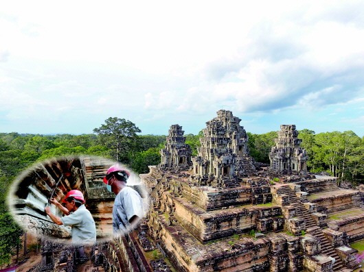 在吴哥考古公园内,如今依然能够看到一些石刻文物用钢筋从中间连接,或者用混凝土甚至红砖来补砌雕刻和墙体,这些不可逆的做法给文物造成了永久的损伤。