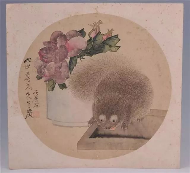 武汉博物馆所藏的这幅团扇,面画直径28.5,纵27.5,横28.5。扇面中画者以干笔淡墨细勾轻批松鼠的背部和尾巴,呈现出毛茸茸的质感。松鼠眼睛圆睁望向下方,似跃跃欲下。旁边白色花瓶之中一枝花正在怒放。扇面左侧书有“心田尊兄先生属”,下有朱文钤印“虚谷”。虚谷(1823-1896),清代著名画家,海上四大家之一,有“晚清画苑第一家”之誉。