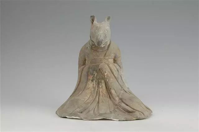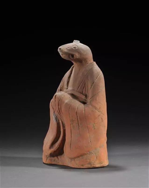 武汉博物馆藏的这件隋代鼠首人身俑,高28.5cm, 底座长28.5cm,宽20.5cm。俑身着长袍,宽衣博袖,腰束丝带,拱手盘膝而坐,通体施彩绘(多已脱落),鼠首面部特征刻画细致。十二生肖俑,又称为十二支神像、十二时神等。古人以天干地支纪年,地支即子丑寅卯辰巳午未申酉戌亥等十二支,十二生肖来源于此。