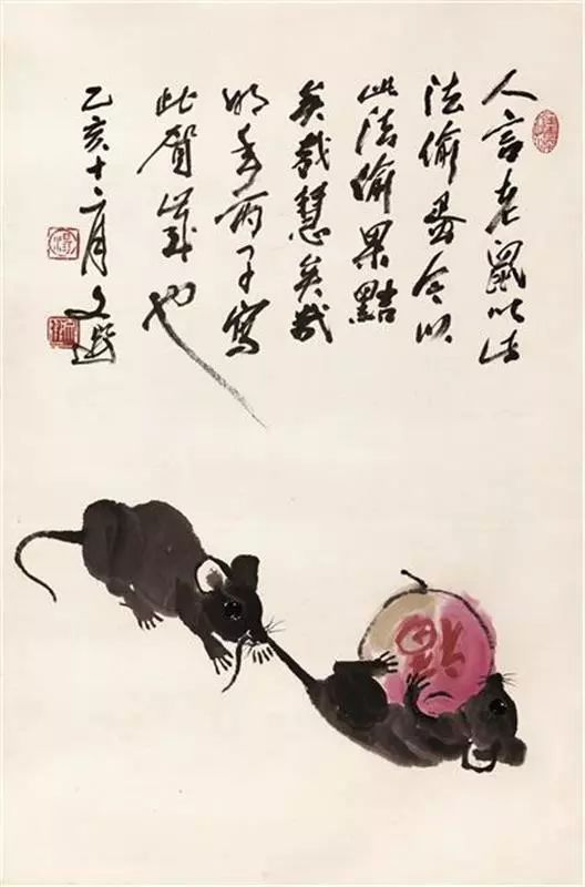 湖北省博物馆所藏的这幅汤文选的《吉鼠贺岁图》,画面中两鼠抢“福”,为鼠年贺岁。