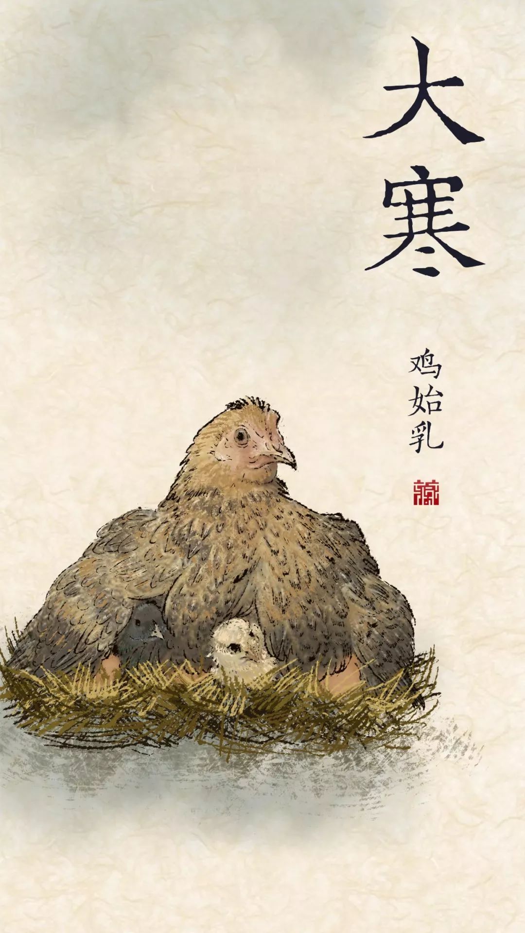 一候,鸡始乳丨意为大寒节气鸡提前感知到春天的阳气,开始孵小鸡。