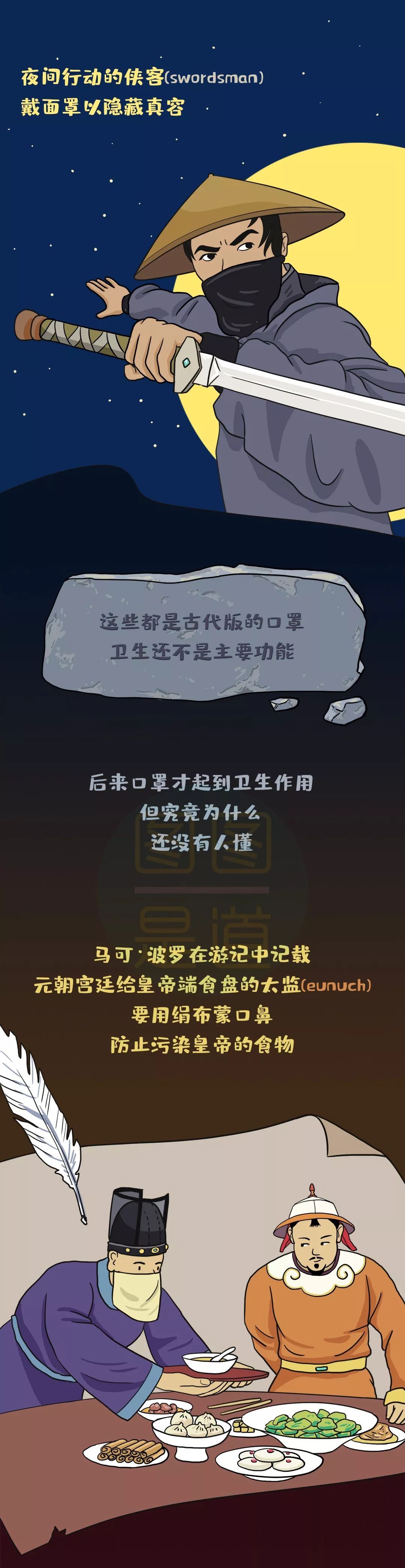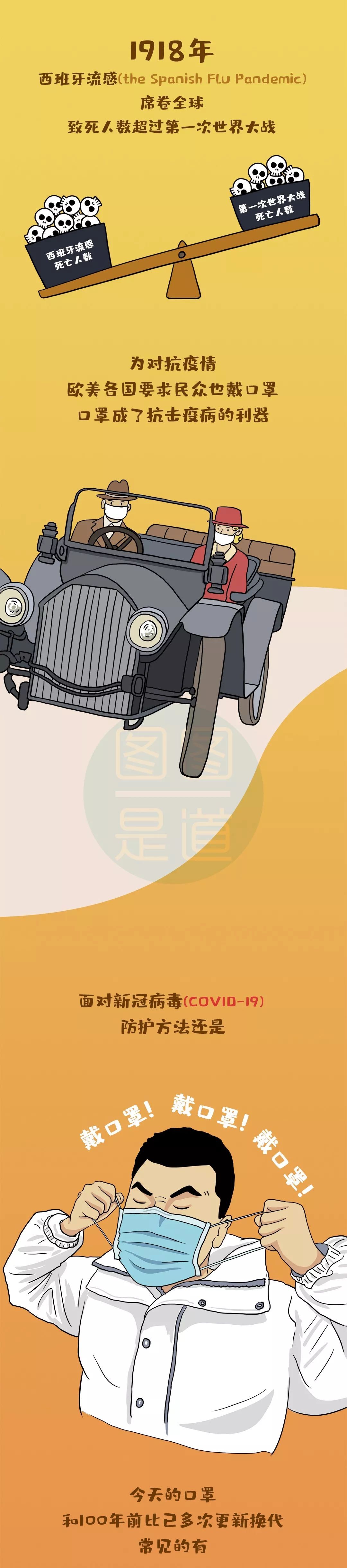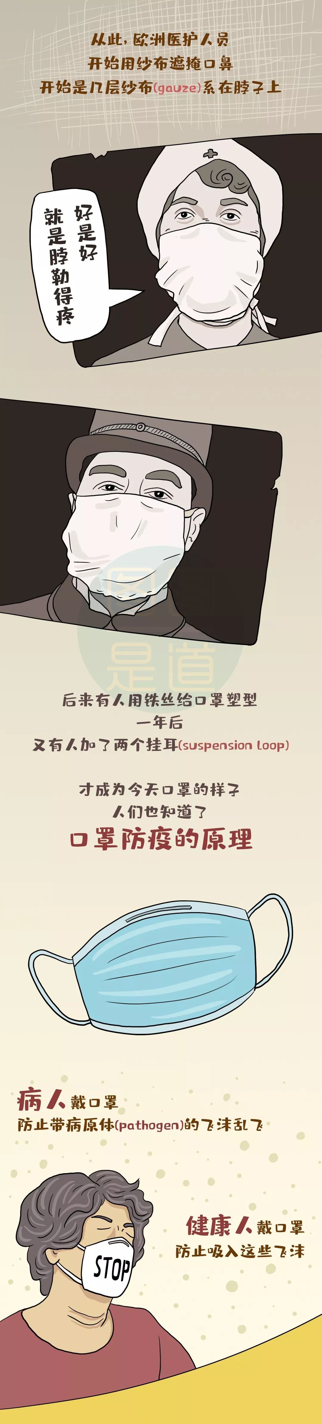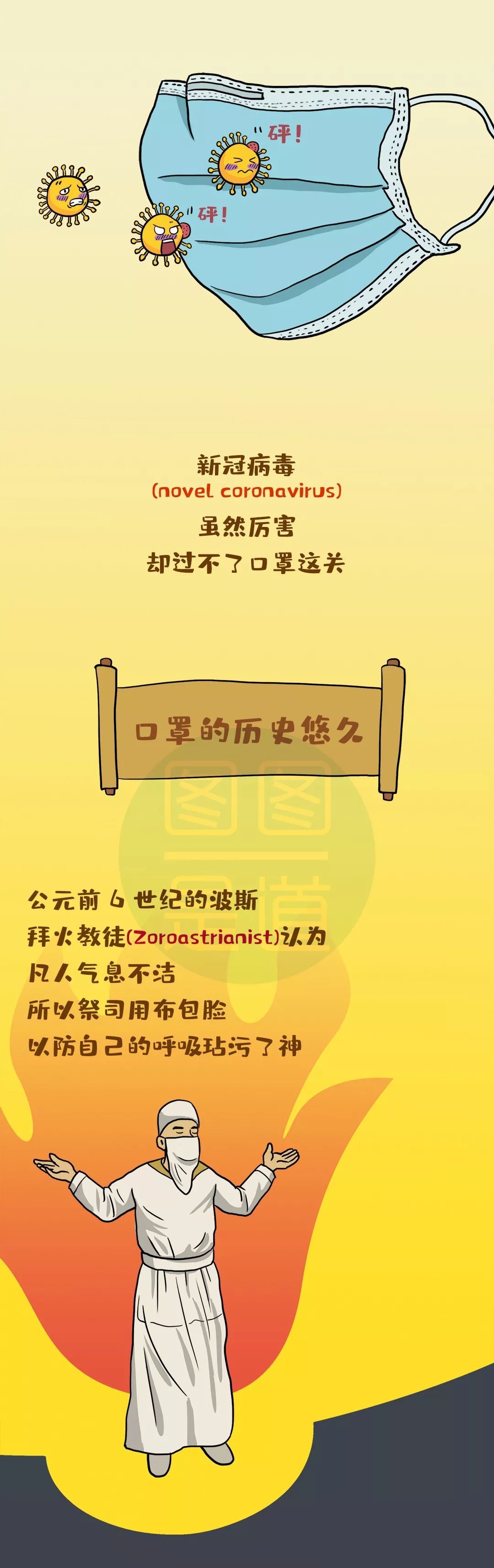 新冠病毒虽然厉害,却过不了口罩这关。口罩的历史悠久,公元前 6 世纪的波斯,拜火教徒认为凡人气息不洁,所以祭司用布包脸,以防自己的呼吸玷污了神。公元一世纪有博物学家研磨朱砂时,用松弛的动物膀胱皮肤掩住鼻子,减少吸入有毒粉尘。在古代中国,长途跋涉的行人以布蒙口鼻以遮尘,春天踏青的仕女,用面纱遮阳,也避免抛头露面……这些都是古代版的口罩,卫生还不是主要功能。后来口罩才起到卫生作用,但究竟为什么,还没有人懂。马可·波罗在游记中记载,元朝宫廷给皇帝端食盘的太监要用绢布蒙口鼻,防止污染皇帝的食物……希望厂家加大产能,让每个人都有足够的口罩用,也希望大家使用医用外科口罩。把N95口罩,留给在一线抢救病人,近距离直面病毒的医护人员,让他们从死神手里抢人时,能更好地保护自己。