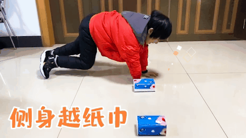 把家里的纸巾间隔30-50cm摆放,让孩子手脚并用、身体侧向移动越过纸巾,就能把全身调动起来了。