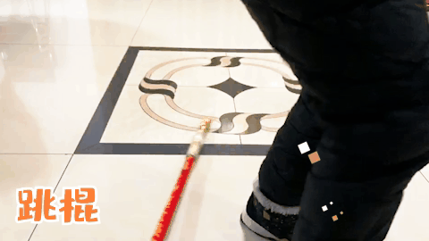 家长拿着棍子,左右慢速贴地摆动,孩子要看准时机起跳,避免被棍子扫到。