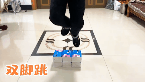 还可以将纸巾间隔30-50cm摆放,孩子双脚连续跳过纸巾。这就给连跳训练增加了更多趣味性。