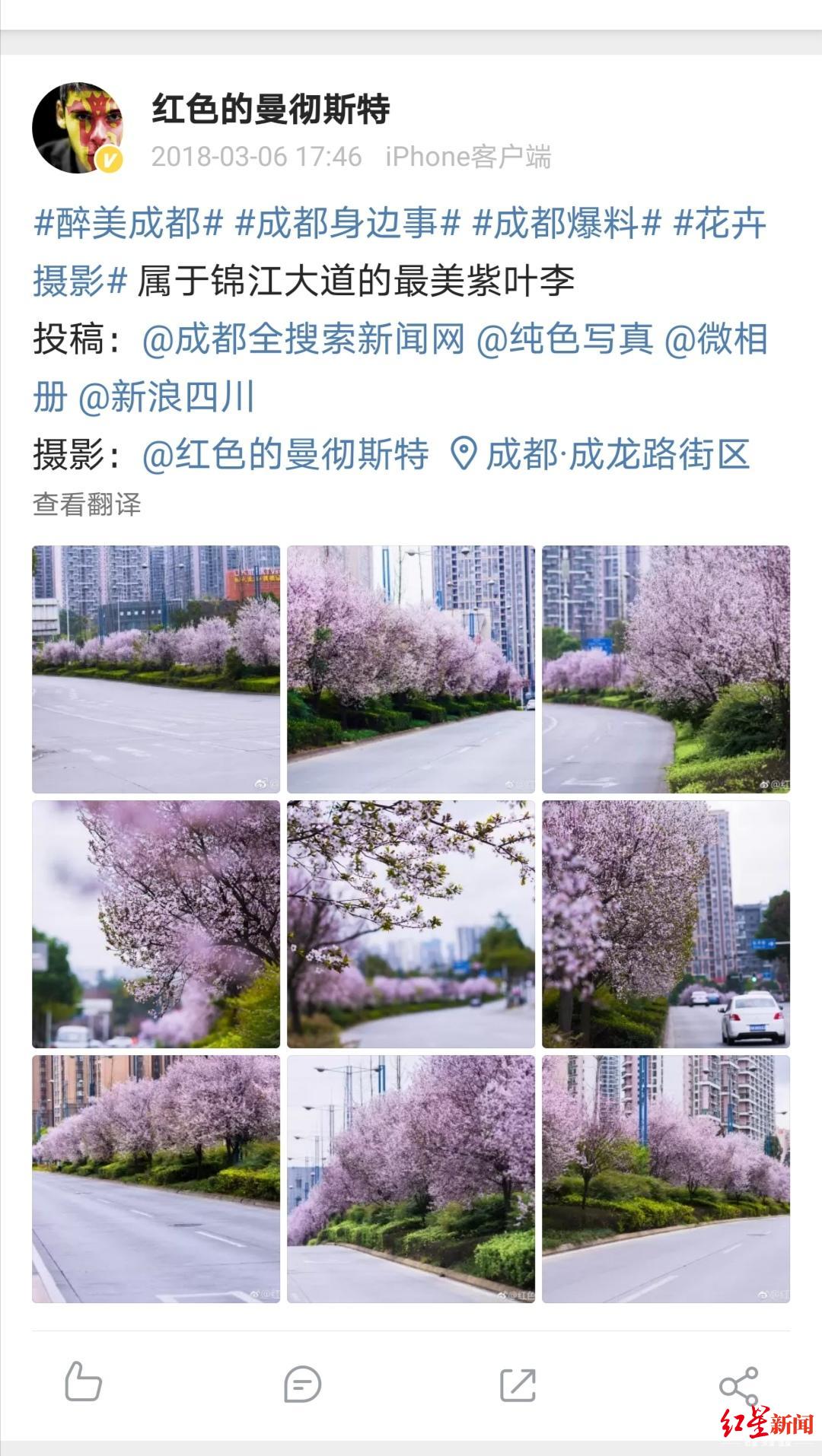 2018年,化迪生家里养了只狗。阳春三月,“有天遛狗的时候,看到小区里种的紫叶李开了花——这提醒了我”。因为工作的关系,他的自由时间挺多,为了拍照挑了一个天气不错的日子:3月6日,多云,但有太阳洒下来。“锦江大道的紫叶李,只在驿都大道和成龙大道中间的路段”,从靠近驿都大道的樱花街开始,化迪生沿着锦江大道一路往南,走走停停拍了一个多小时。