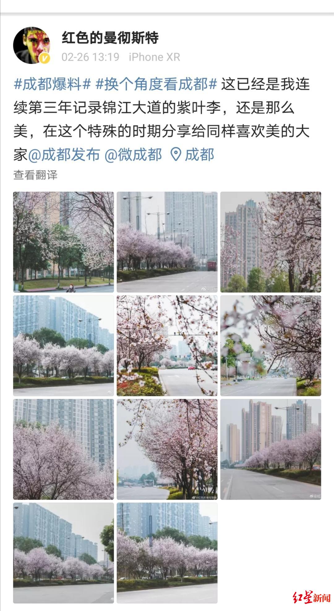 2月26日上午,戴上口罩和一次性手套,化迪生又把相机镜头对准了成都锦江大道的紫叶李。路上人不多,来去匆匆,车比一周前多了许多,驿都大道、三环路上甚至还出现了堵车。这是化迪生和锦江大道上的紫叶李相逢的第三个春天。