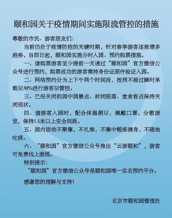 针对近日公园有人流聚集的现象,颐和园2月27日发布了疫情期间的限流管控措施,将从即日起采取分时入园,提前一天预约购票等方式确保疫情防控。