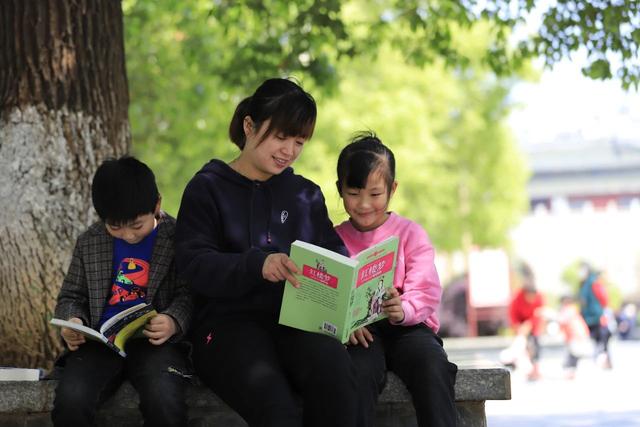 在江西省庐山市周瑜点将台景区前,小学教师曹九庐领着女儿熊玥淇、儿子熊望舒正在享受家庭美好阅读时光。
