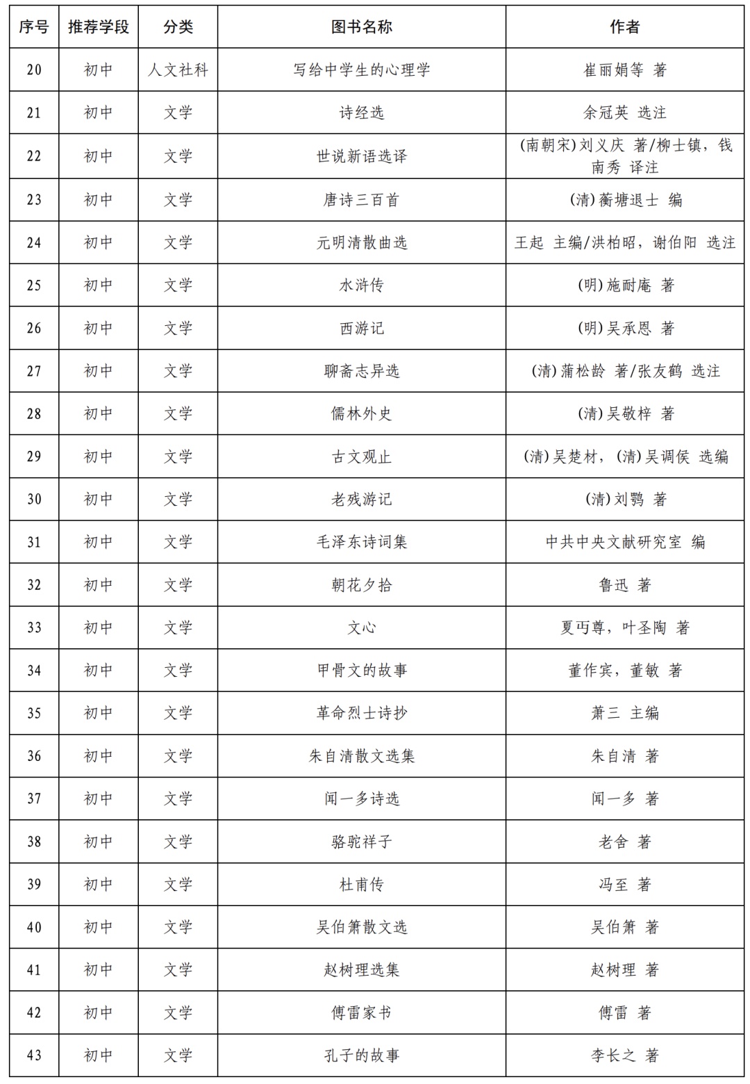 4月22日,受教育部委托,教育部基础教育课程教材发展中心组织研制并发布了《教育部基础教育课程教材发展中心中小学生阅读指导目录(2020年版)》。