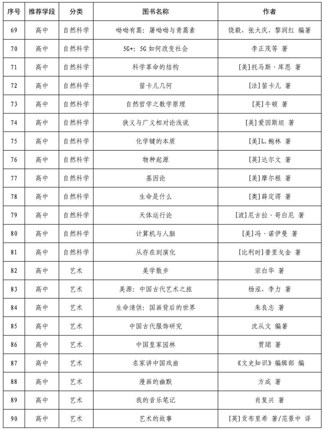 指导目录分为小学、初中、高中三个学段,其中小学110种、初中100种、高中90种,统筹考虑了中小学生阅读时间、阅读特点和阅读数量,供学生自主选择阅读。
