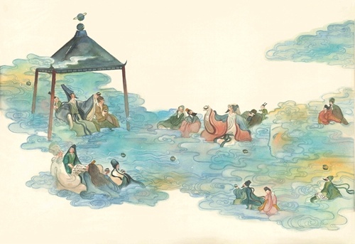 澎湃新闻:在书中“曲水流觞”场景的两个大拉页上,人物之间出现了很多动物和神兽的形象,有些画面占比还非常大,这个设计是有什么特别用意吗?