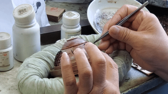 掐丝更是依赖师傅们灵巧的双手。正如叶圣陶在《景泰蓝的制作》一文中所写,“且不说自在画怎么生动美妙,图案画怎么工整细致,单想想那么多密密麻麻的铜丝没有一条不是专心致志粘上去的,粘上去以前还得费尽心思把它曲成最适当的笔画,那是多么大的工夫!”
