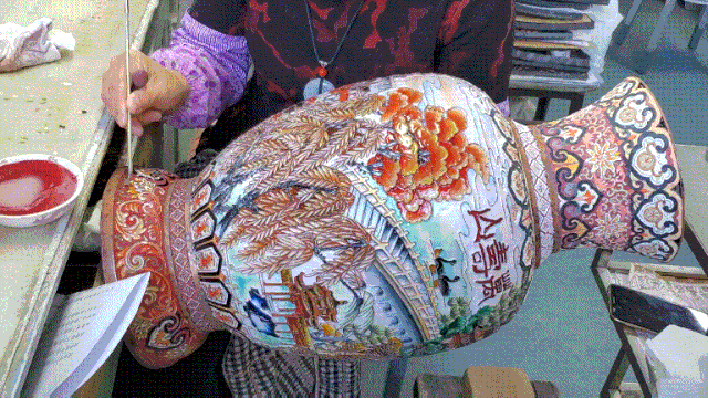 不仅是重要的献礼作品,其实珐琅厂的作品几乎都是纯手工制作完成的。景泰蓝的制作有几十道工序,主要有制胎、掐丝、点蓝、磨光、镀金等。