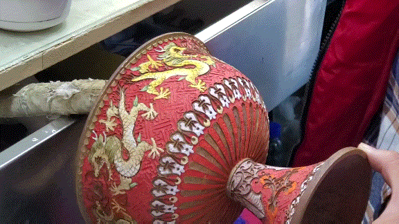 “目前除了小件之外,都是纯手工制胎”,衣福成指着旁边的作品说,“像这样三四米的瓶子,都是完全用铜板手工捶打出来的。”