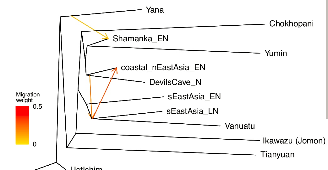 △三个迁移事件的最大似然系统发育图,箭头代表迁徙方向。