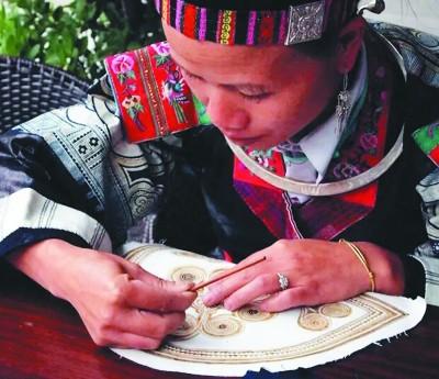 苗族妇女在向观众展示蜡染技艺 李韵摄/光明图片
