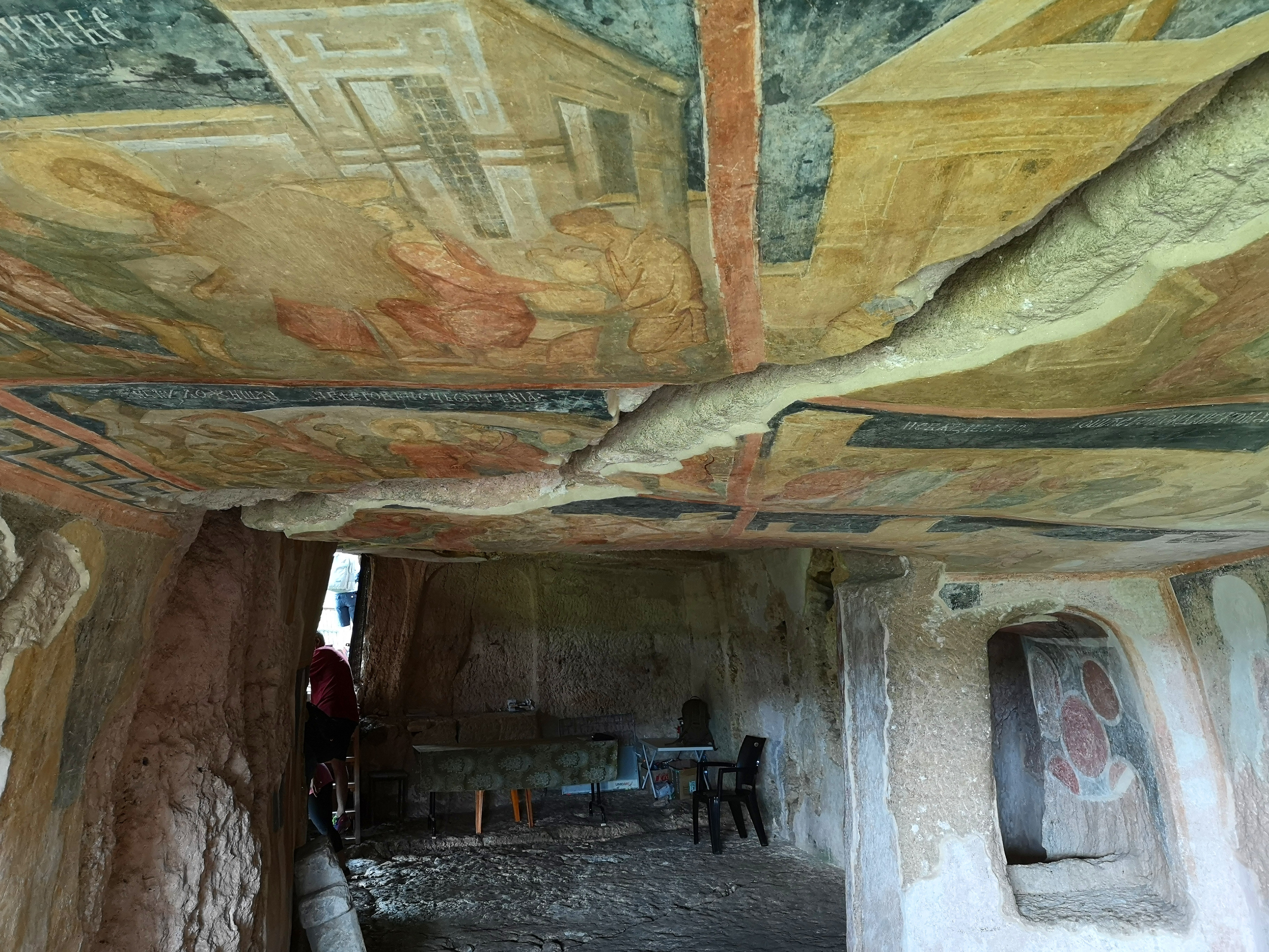 在漫长的岁月里,几代修士攀上悬崖,用简陋器具开凿石壁、挖掘山洞、兴建教堂。最后,他们在教堂里绘制风景和人物壁画,呈现基督教历史和古希腊传说。因为历史进程,他们也采用了拜占庭式的构图风格。如今的岩洞教堂,墙面和天花板在岁月沧桑中变得斑驳,许多壁画变得残缺不全,人像的五官变得模糊,但仍可见昔日精美。