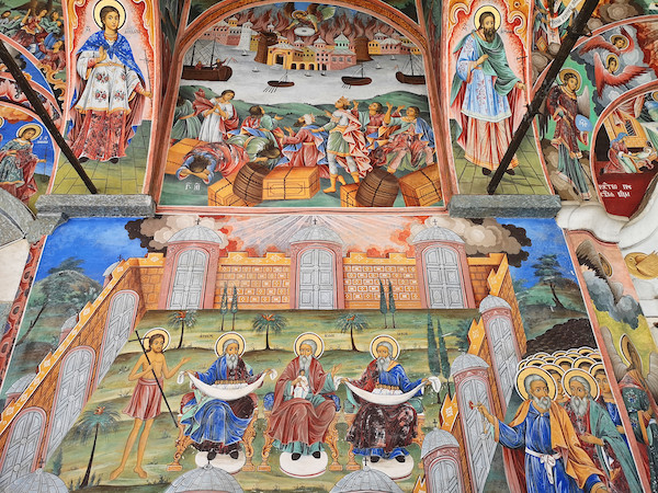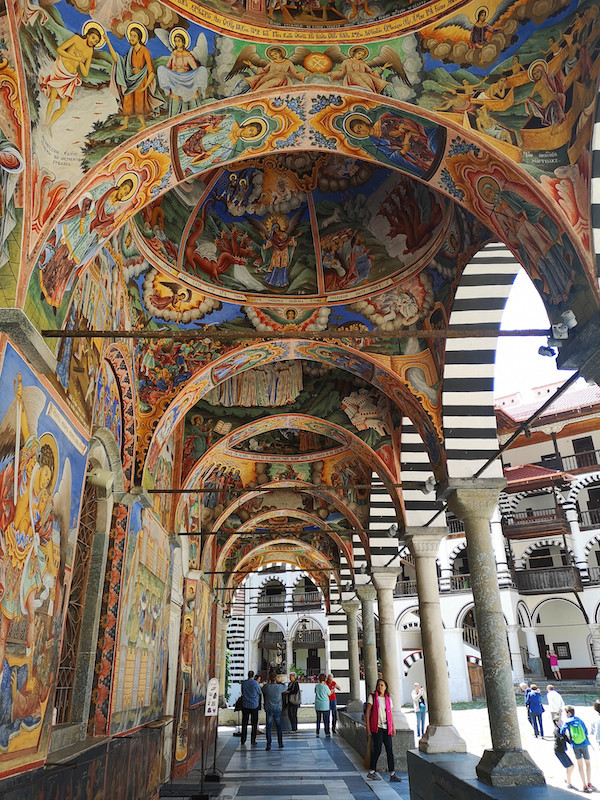 最抢眼的建筑当然是位于修道院中央的圣母升天大教堂,它内部有三个精美穹顶,惜乎不可拍照。外部柱廊环绕,布满壁画,也是游客最爱流连之处。这些覆盖墙身与天花板的壁画,形成了色彩的奇妙搭配,记录了各种宗教故事,也记录着一代代保加利亚人的虔诚。