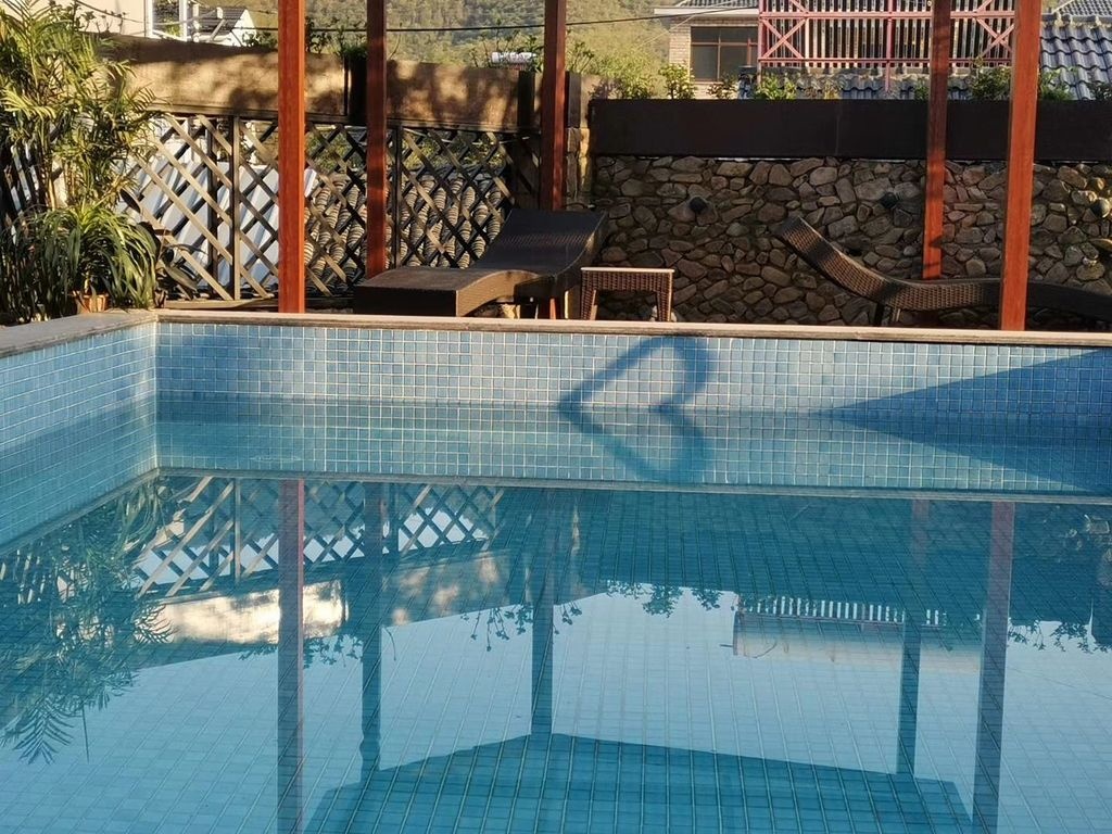 泳池的水刚好放到那个水位,栏杆刚好被夕阳倒映在那个地方。