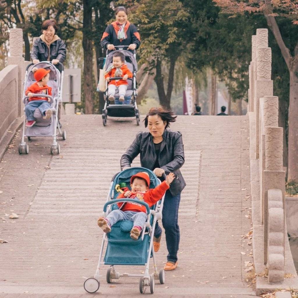 小朋友们笑着、闹着、拉扯着大人的手,歪歪扭扭地往前走着。