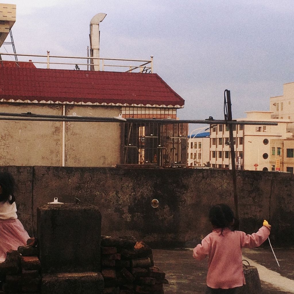 在某天傍晚的时候,拍到隔壁家妹妹在玩泡泡,穿着小裙子跑来跑去。