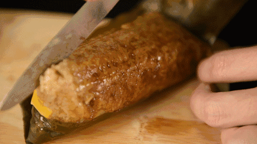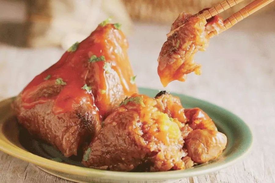 嘉兴肉粽,用一种烹调的手法把猪肉用酱油、黄酒腌制,用糯米覆盖,裹上粽子。在蒸煮的过程中,猪肉的油脂和调料进入糯米里,宛如猪油拌饭一般,顺滑咸香。