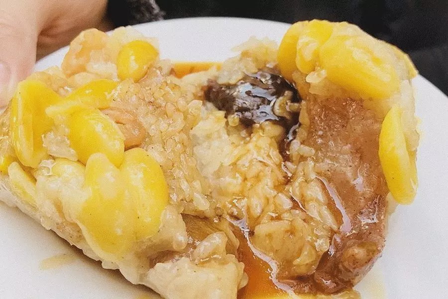如果你嫌馅料不够丰富,广东最常见的粽子都能满足你的需求,绿豆沙绵,糯米柔韧,猪肉肥而不腻,还有冬菇、虾仁、干贝、鱿鱼、板栗、芋头、瑶柱、叉烧、排骨、玉米、鸡肉、马蹄…...地上跑的,天上飞的,水里游的,都能入粽。