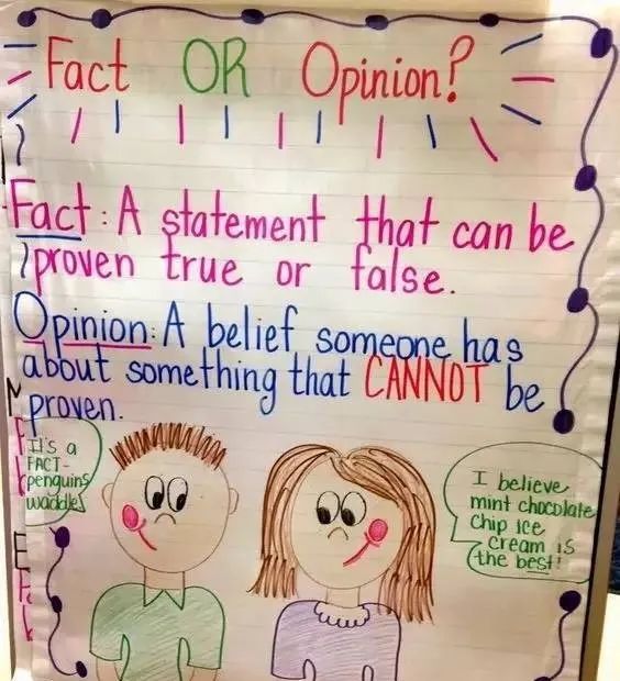 在英美教育体系里,孩子从幼儿园开始,就经常做一种练习,叫:Facts and Opinions ,给小孩一句话,一段文字,甚至一篇文章,让他们区分,这是一个事实,还是一个观点?