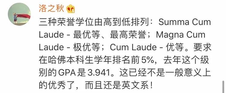 有网友科普说,在哈佛,三种荣誉学位当中,Summa Cum Laude 最优等、Magna Cum Laude 极优等、Cum Laude 优等。