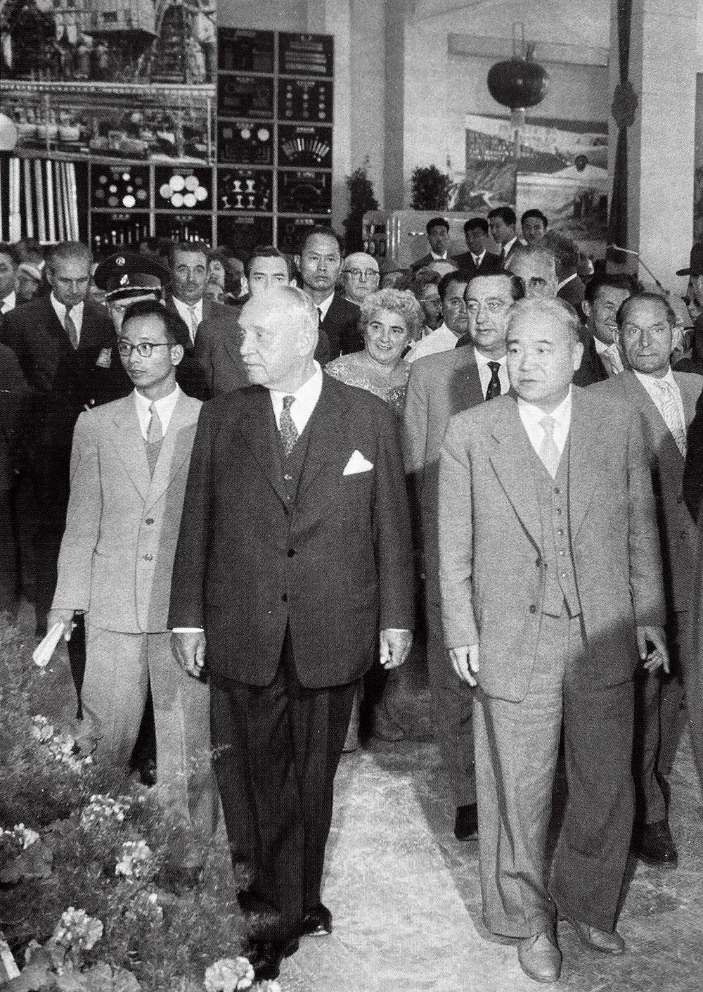 1959年9月的维也纳秋季国际博览会上 ,冀朝鼎陪同奥地利副总理布鲁诺·皮特曼参观中国馆。右一为冀朝鼎,左一为钱二鸿。图/受访者提供