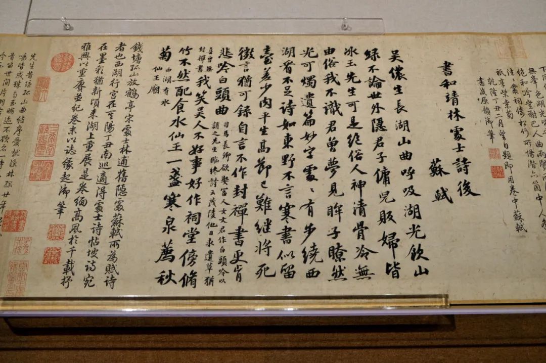“以梅为妻、以鹤为子”的林逋应友人之索而书自作诗5首,卷后有苏轼书和诗一首,是苏轼50岁左右所书。两位著名诗人的书作合璧于一卷,相映生辉,是不可错过的长卷之一。