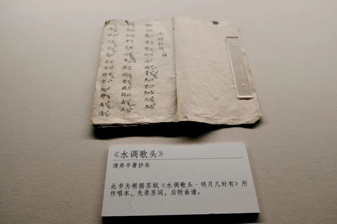 此书为根据苏轼《水调歌头·明月几时有》所作唱本,先录苏词,后附曲谱。“明月几时有,把酒问青天”,这首词想必人人都能诵读,若能够读懂曲谱,不妨跟唱两句。