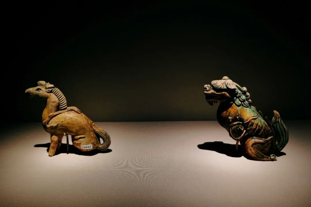 明早期大式建筑屋脊上的兽形装饰物,俗称“小跑子”,也称“脊兽”,寓意吉祥。这两个高17厘米、宽22厘米的黄绿琉璃走兽分别是马和狮子的形状,现收藏于南京博物院,和展厅里的其他琉璃物件一起观赏,可以一窥故宫最初的模样。