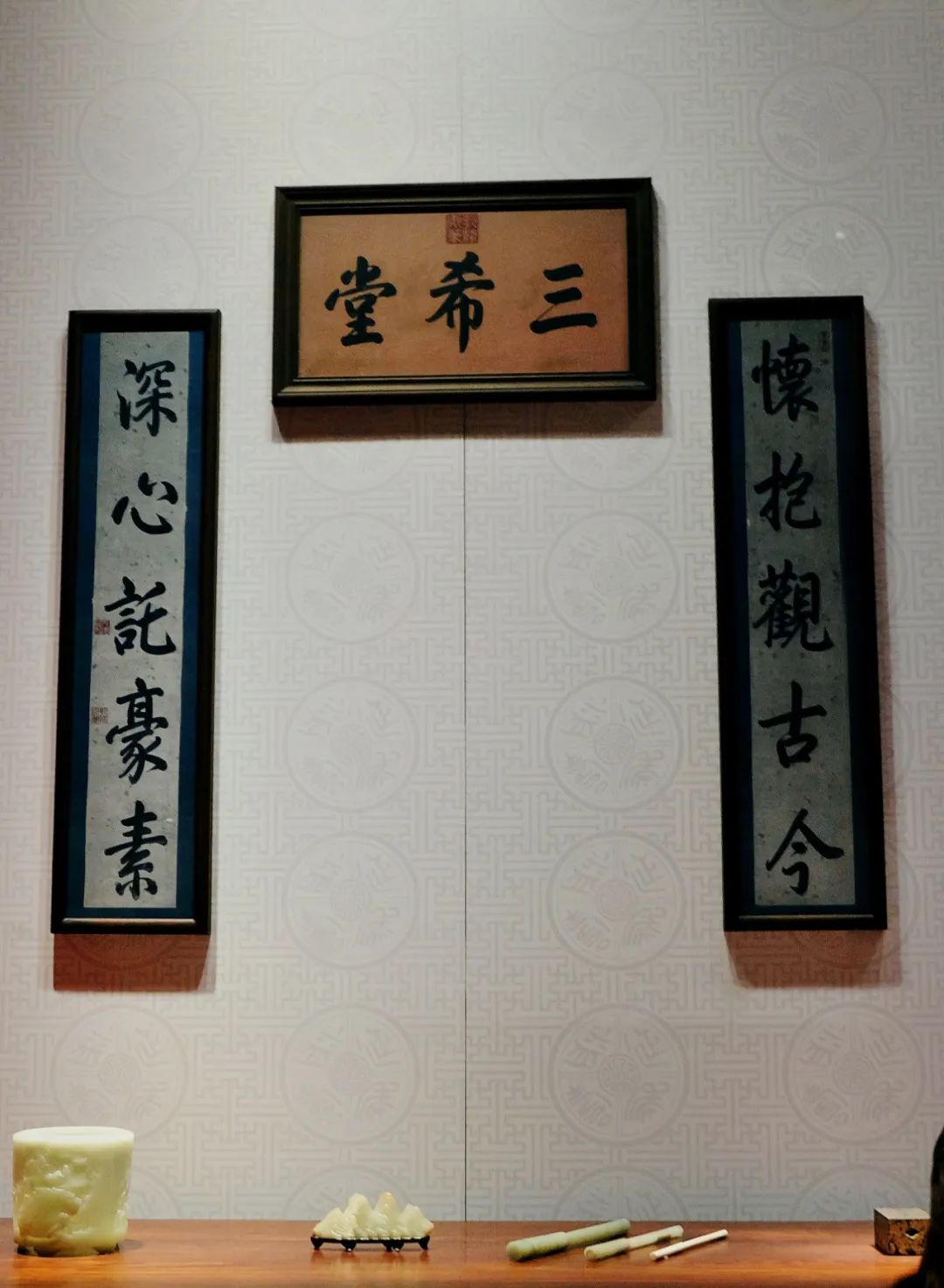 三希堂,位于养心殿西暖阁,是贮藏王羲之《快雪时晴帖》、王献之《中秋帖》和王珣《伯远帖》的地方,乾隆帝专门为其作了“怀抱观古今,深心托豪素”的字对。象牙管“万国来朝”紫毫笔、青玉松竹梅纹管笔、青玉行旅图笔筒等,皆是用料上乘、制作精美的文房用具。