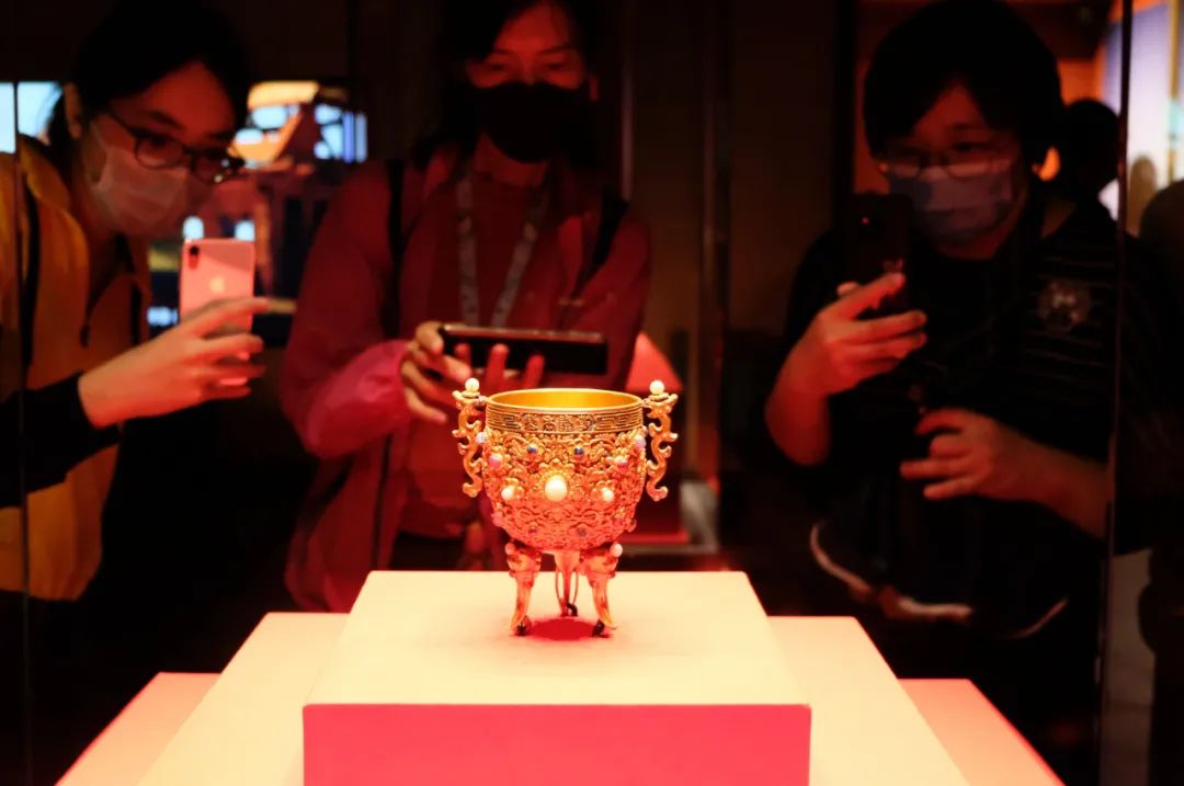乾隆帝专用酒杯,因登上《国家宝藏》而为人们所熟知,也是这次展览中的C位。每年元旦子时,乾隆帝都会用此杯饮用能消灾延寿的屠苏酒,再点上蜡烛,写下新年祝福,祈求国泰民安、风调雨顺。