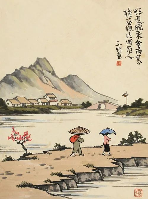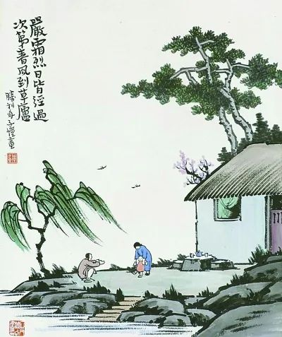 先生的画集《古诗新画》,在艺术上可谓达到最高水准。当然,这也经日益精进之过程。初有完全以古诗写古意者,如为国画,就笔墨而言,并无墨分五色之妙,可谓有笔无墨,但一旦以之为人物的背景,引入诗词,则境界升华。