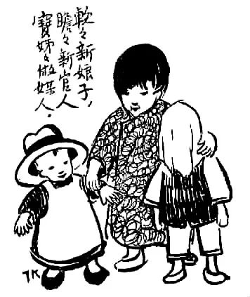 于儿童经验之局限写其心灵之天真,于不起眼的、平常人视之无所谓的现象中发现童心之美。还有一幅令人印象深刻,三个孩子,一女稍高,立于中,左侧男孩,戴英式礼帽,甚大,右侧女孩,头蒙面布,题曰“软软新娘子,瞻瞻新官人,宝姊姊做媒人”。其事极不现实而孩子极慎重,于儿童显示童心童趣,于画则表现了先生的爱心和幽默。