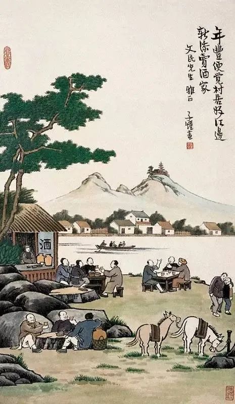 平民性、草根性、雅中求俗,是子恺漫画的精神。同样画竹林下茅屋,大幅画面下有二平民装束者,面目不清,题曰“年丰便觉村居好,竹里新添卖酒家”。