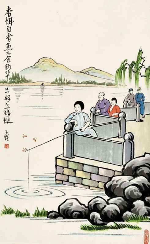 如画一现代女学生于垂柳下的平台垂钓,如仅仅为画,则平淡无奇,先生题诗曰“香饵自香鱼不食,钓竿只好立蜻蜓”,意味增添了两个:第一,少女怀春,内心默默期待;第二,女性爱情焦虑不能明言,古今皆同。