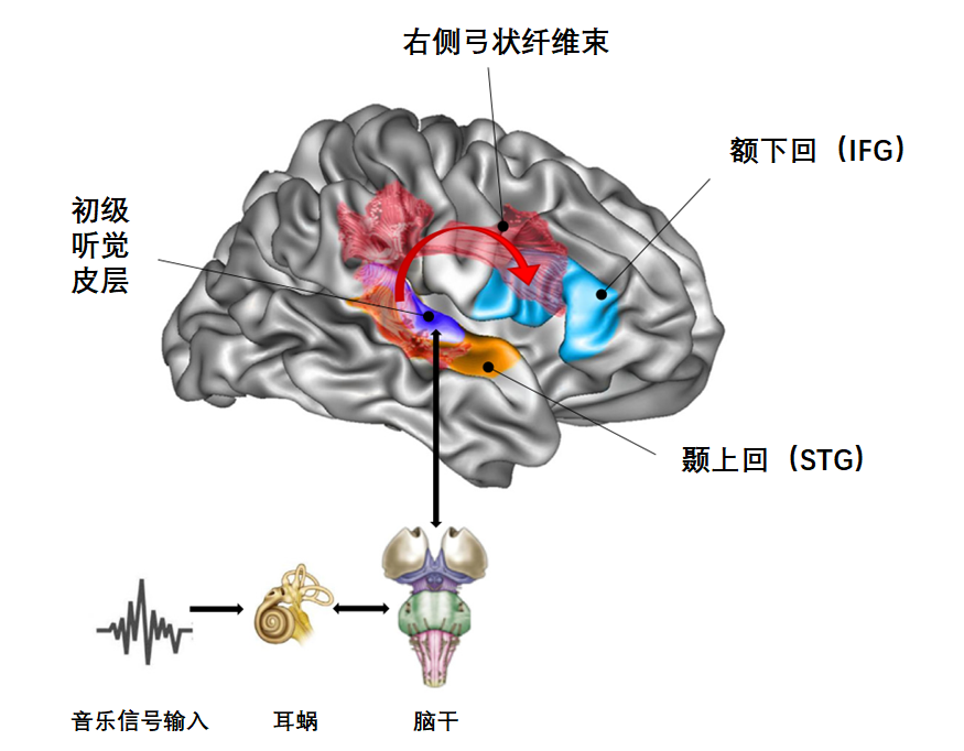 她发现乐盲人群相比正常人,额下回(inferior frontal gyrus,IFG)和听觉皮层的颞上回(前文提到的STG)之间的右侧额颞叶联结网络表现出异常,颞下回(inferior temporal gyrus)和听觉皮层之间的联结减少,连接听觉皮层和额叶皮层的右侧弓状纤维束(arcuate fasciculus)也减少了。