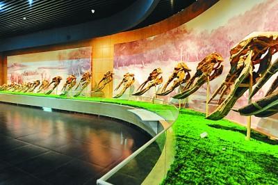 和政古动物化石博物馆共有临夏地质馆、生命进化馆、和政化石陈列馆等三个陈列馆。在“六项世界之最”展厅区,虎文花站在铲齿象化石展区前介绍起来:“博物馆有一套化石弥足珍贵,那就是铲齿象全球唯一一套从幼年到老年的发育系列标本头骨,保存这样完整的化石在世界任何馆藏机构都很难见到,因保存完整,这套化石曾在上海科技博物馆、台湾国立科技博物馆等地展出,影响力非常大,被誉为‘华夏瑰宝’。”铲齿象头骨发育系列化石标本从三四个月到40多岁以序排列,人们能够直观看到不同年龄段铲齿象头骨化石的大小特征。