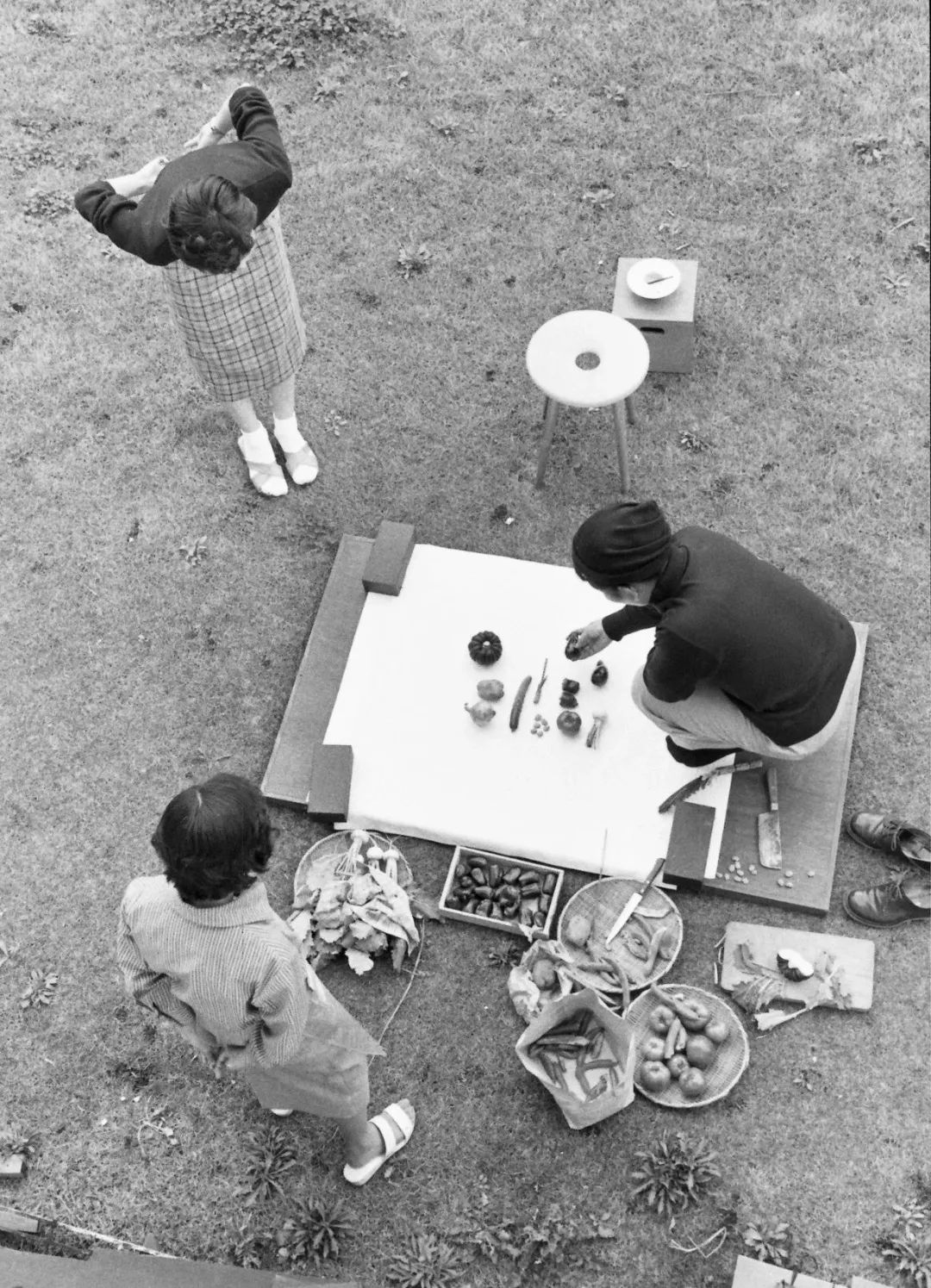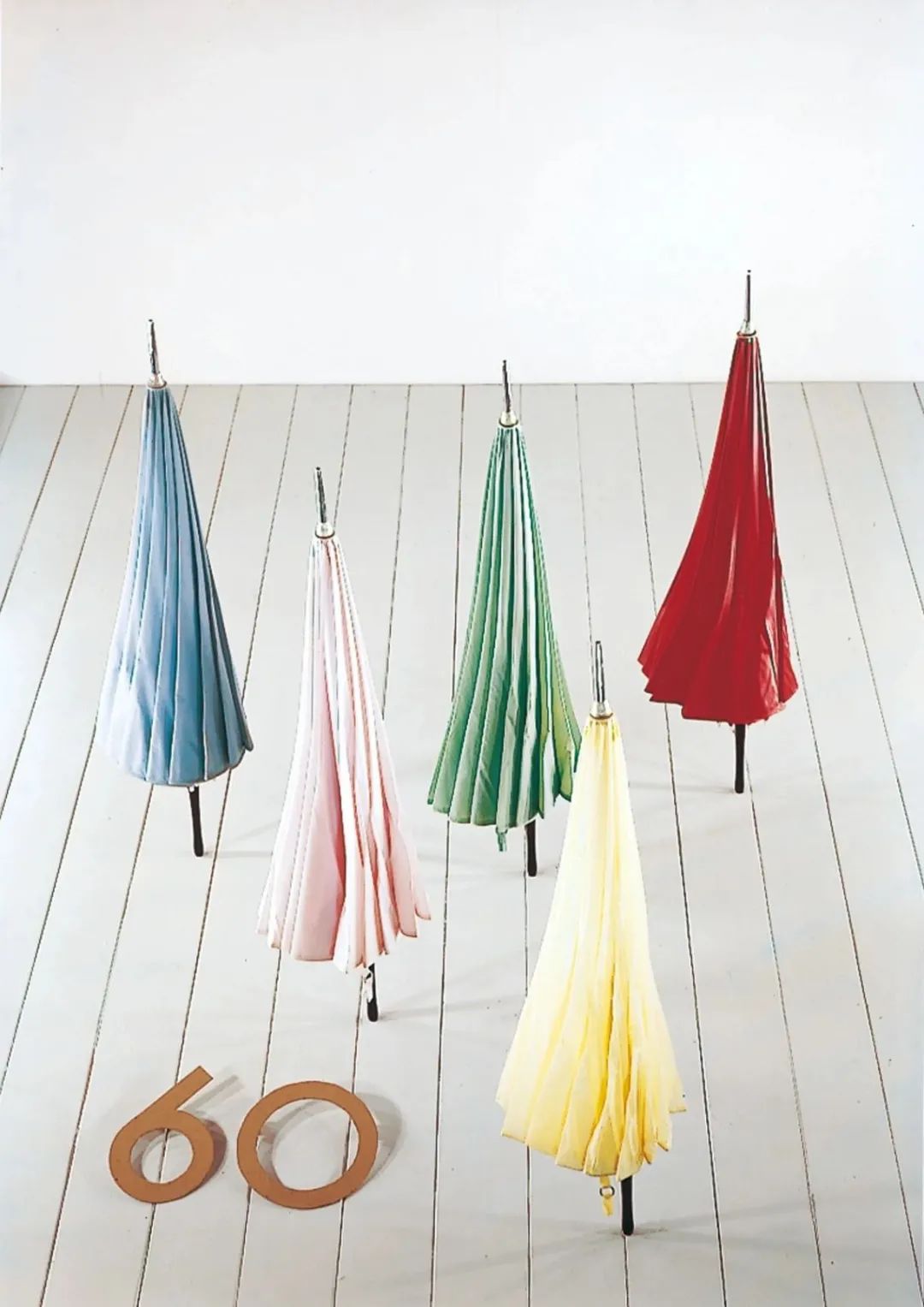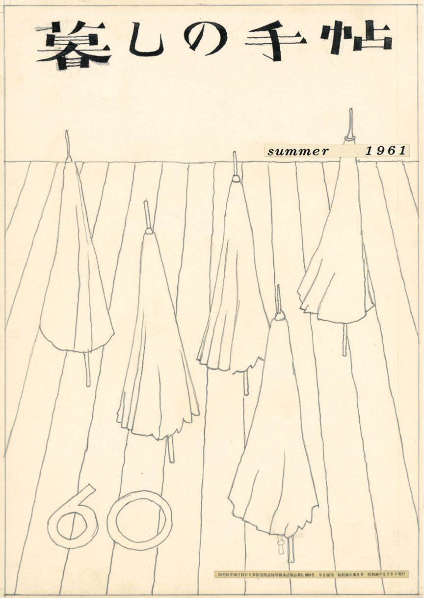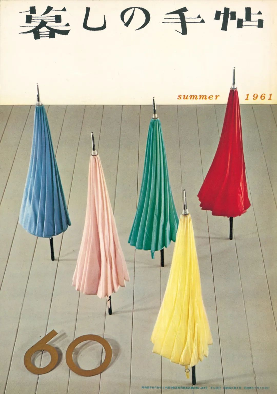 《生活手帖》第1世纪60号(1961年7月),在做吸尘器的商品测评时使用的板上开孔,插入伞柄,然后拍下照片。花森安治来回调换不同颜色的伞,反复开闭,以观察效果。