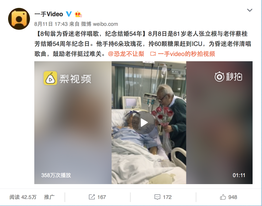 梨视频8月11日发布一则短视频《8旬翁为昏迷老伴唱歌,纪念结婚54年》,再一次让众多网友泪目。