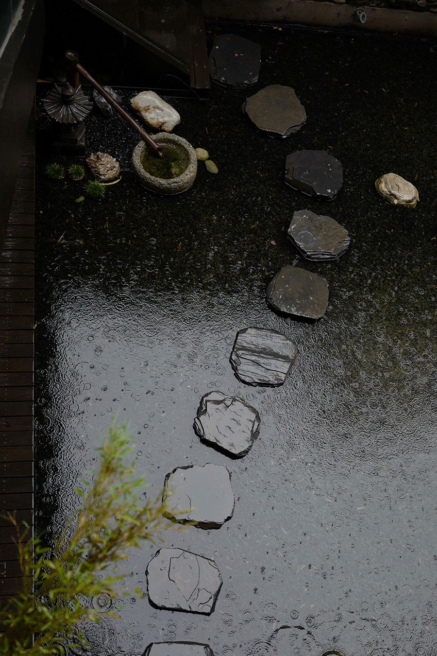 铺满白石的院中,有一棵苍松,和一块巨石。老人拿着铁耙,一遍遍地画曲线。慢慢地,白石化成一圈圈波浪,他坐着的石椅也仿佛落入海中,落入清寂、空灵、极致的美里。