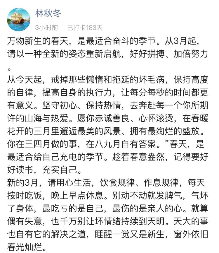 3月,学会戒掉拖延,充实自己。专注于享受过程,摆正心态,而非预想过于圆满的结果,也不必给自己过大的压力。